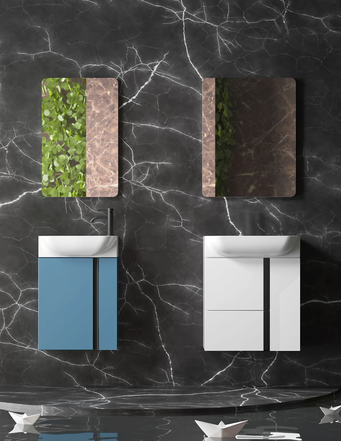 Muebles de baño suspendidos o muebles pequeños de baño con patas. Los diseños de los muebles de baños pequeños son líneas rectas y sencillas que dan al mueble un toque de naturalidad.