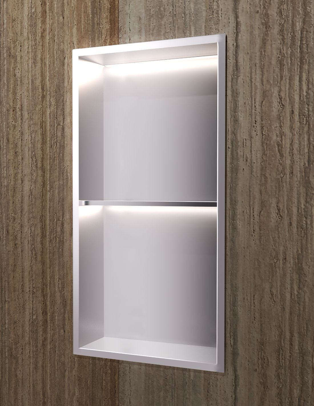 Dale un toque moderno y actual a tu baño colocando nuestra hornacina doble LED de acero inoxidable en acabado níquel. Es un estante perfecto para guardar jabones, champús, maquinillas de afeitar y otros artículos de ducha y baño.