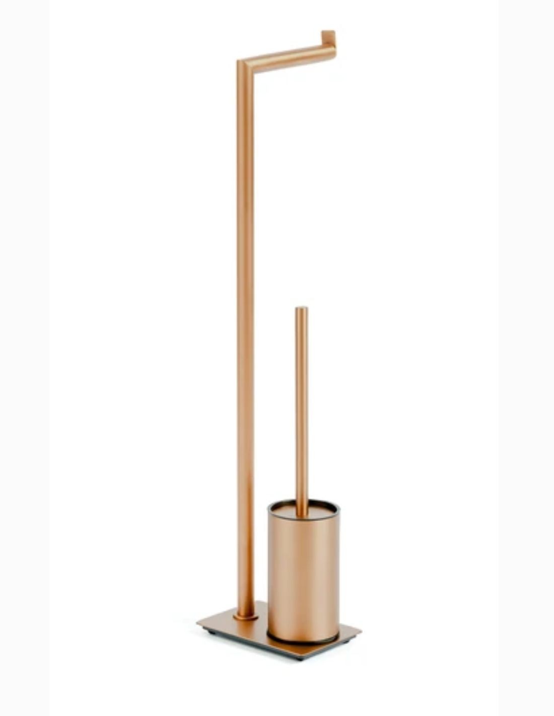El portarrollos con escobillero bronce de Manillons Torrent es una solución todo en uno que combina funcionalidad y diseño en el cuarto de baño. Su acabado bronce cepillado aporta un toque de brillo y elegancia, ideal para espacios modernos y atemporales.