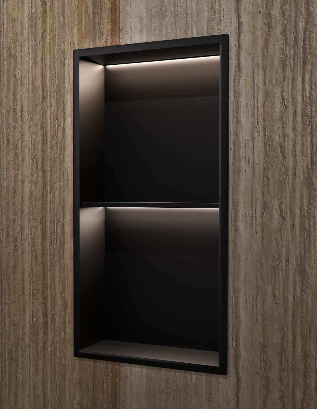 Dale un toque moderno y actual a tu baño colocando nuestra hornacina doble LED negra de acero inoxidable. Es un estante perfecto para guardar jabones, champús, maquinillas de afeitar y otros artículos de ducha y baño.