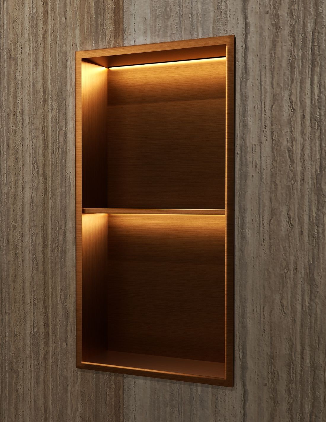 Dale un toque moderno y actual a tu baño colocando nuestra hornacina doble LED oro rosa cepillado de acero inoxidable. Es un estante perfecto para guardar jabones, champús, maquinillas de afeitar y otros artículos de ducha y baño.