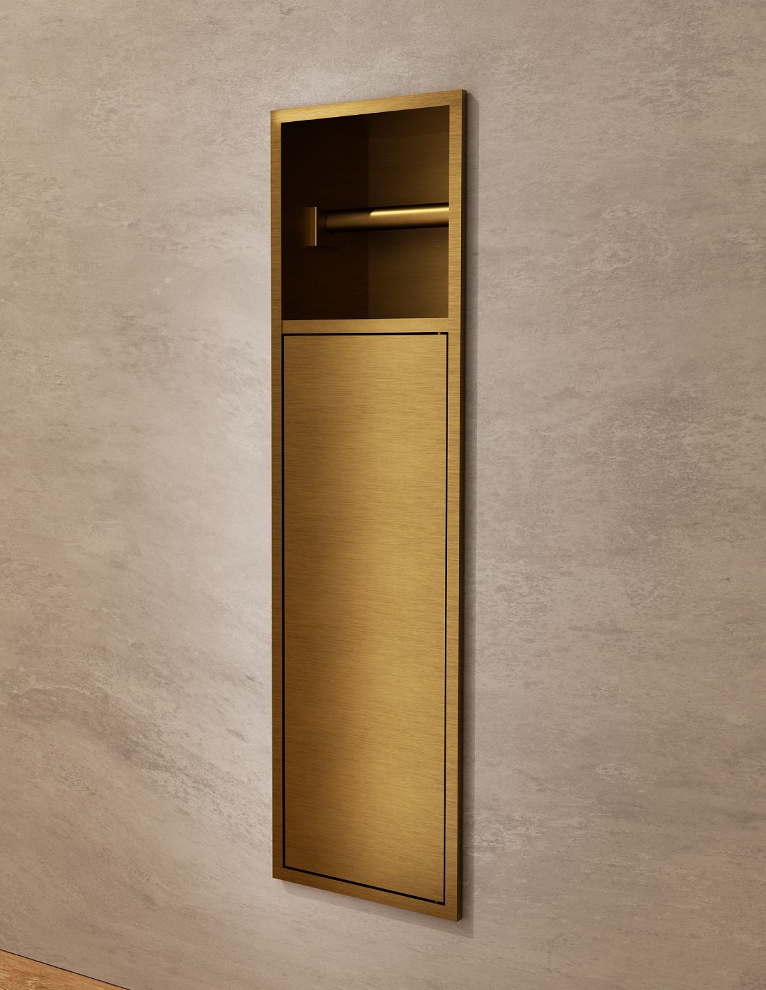 Dale un toque moderno y actual a tu baño colocando nuestra hornacina portarrollos y escobillero oro de acero inoxidable. Es un estante perfecto para colocar tu rollo de papel higiénico y el escobillero quedando oculto de la vista. Así le darás a tu baño ese toque elegante y minimalista que ofrece este accesorio.