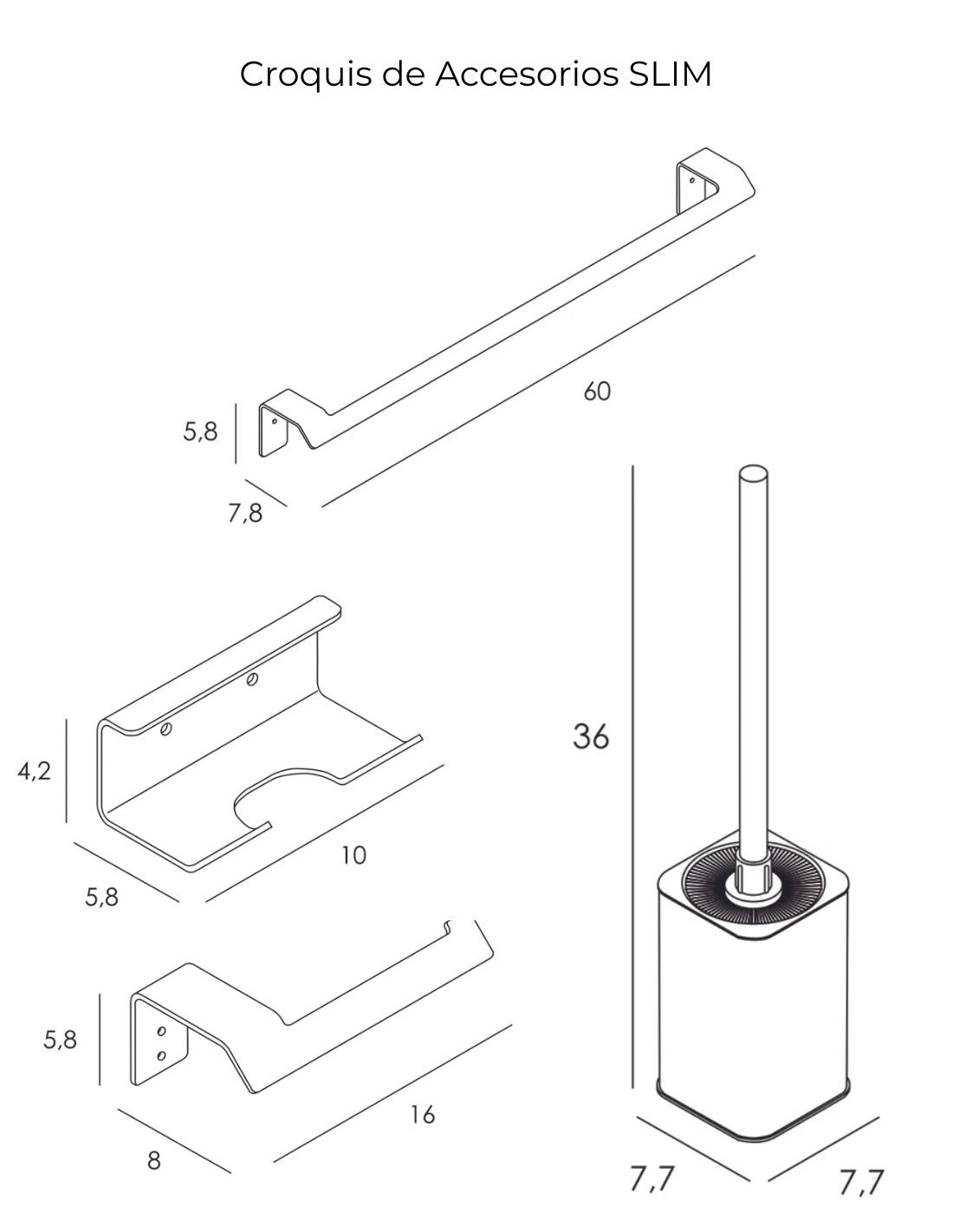 Incluye: Toallero barra grande, percha doble, portarrollos y escobillero de suelo.