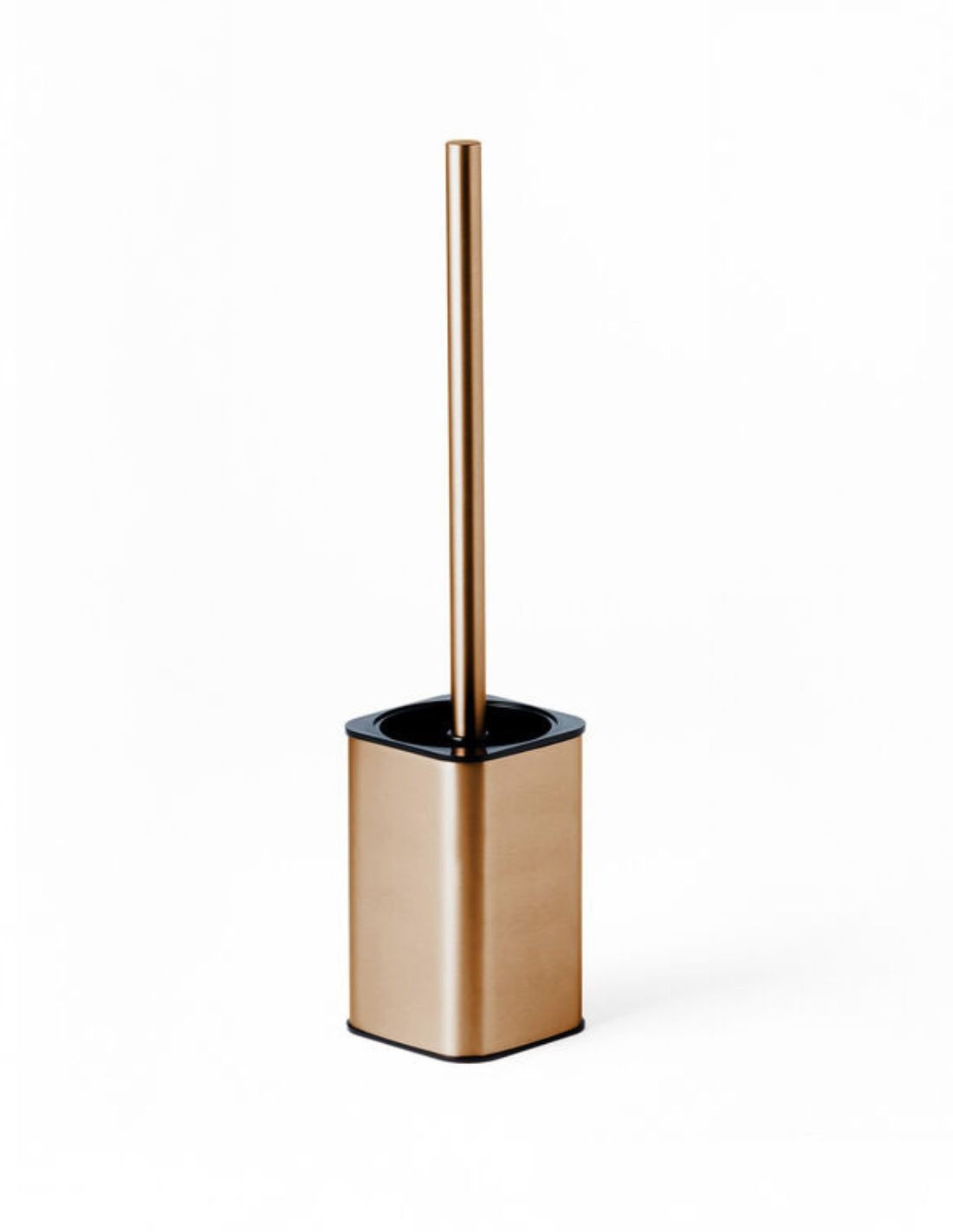 El Escobillero suelo oro/cobre - Quadra de GME es un accesorio autoportante que destaca por su robustez y su diseño de líneas rectas. Su estructura de sección cuadrada ofrece una estética arquitectónica que oculta el cepillo con total elegancia. Fabricado en Acero Inox 304, garantiza una resistencia máxima frente a la humedad y el uso de productos de limpieza en la zona del sanitario.