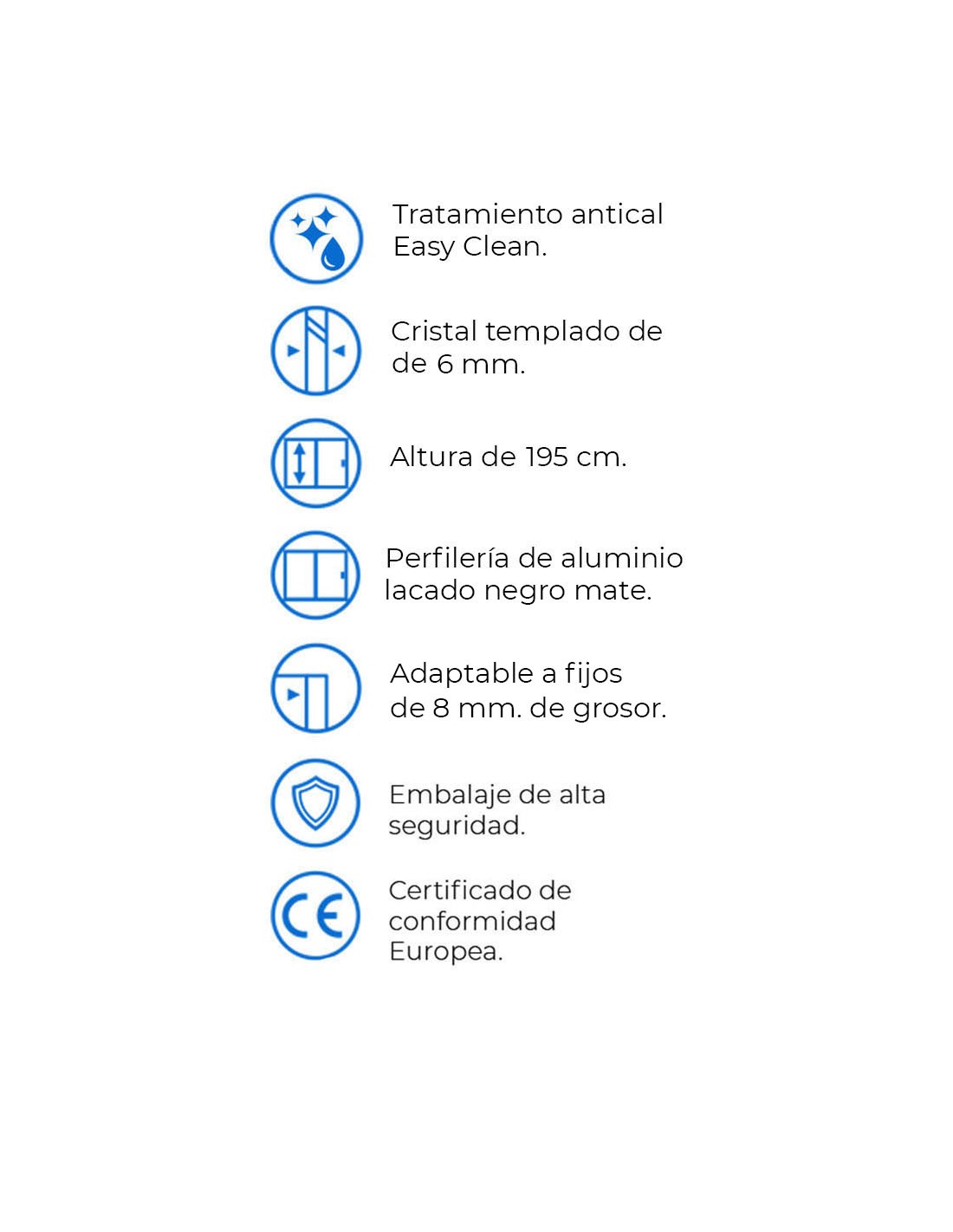 Vidrio templado de seguridad de 6 mm. Tratamiento Antical incluido "Easy Clean". En caso de rotura se parte trozos pequeños que no se desprenden de la estructura de la mampara.