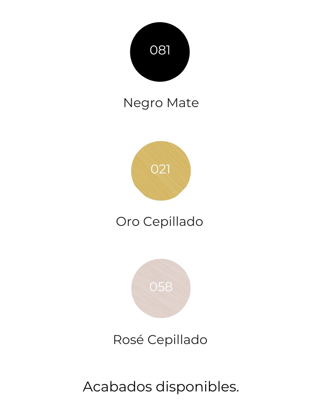 Acabados: Negro Mate, Oro Cepillado y Rosé Cepillado.