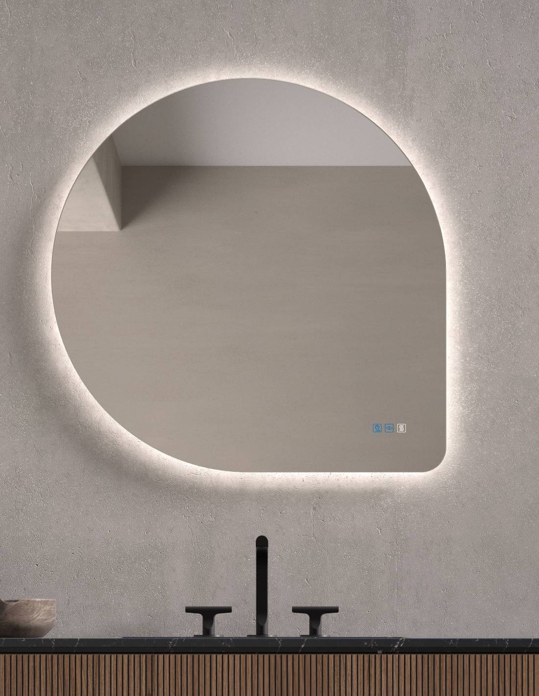 Espejo de baño redondo LED modelo GÜEL de Dyled con forma de gota.