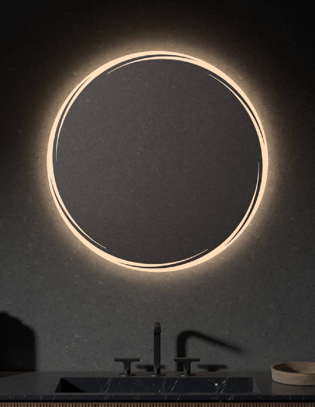 Espejo de baño redondo LED modelo AQUILEA de Dyled con diseño de banda iluminada asimétrica para darle a tu cuarto de baño un toque único y moderno.