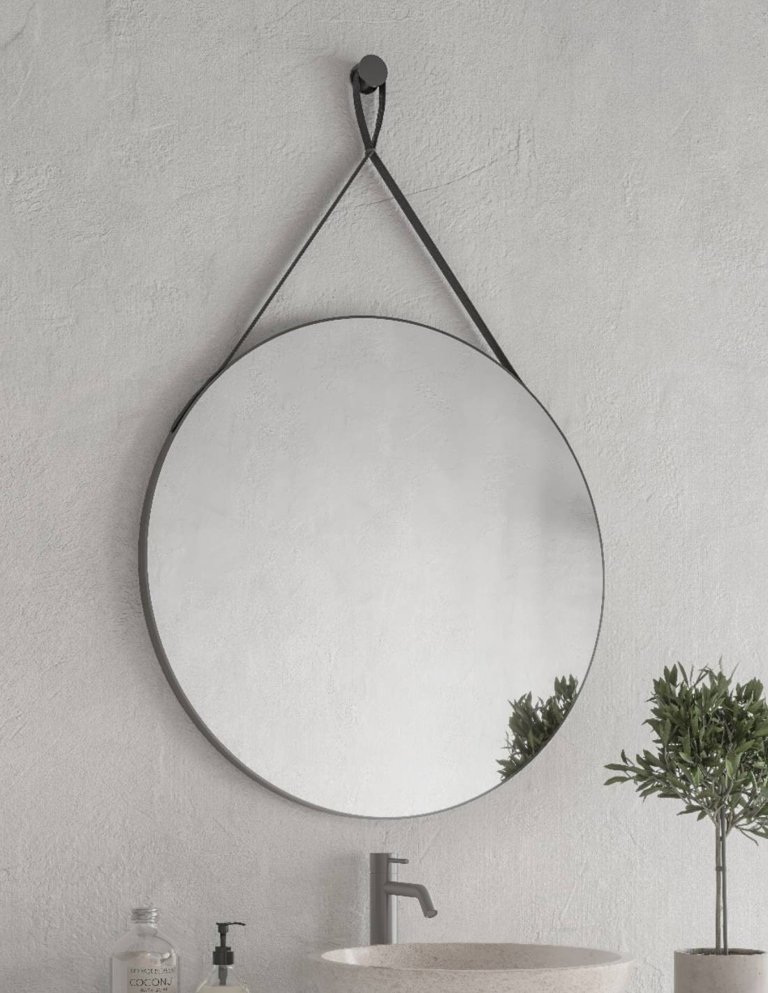 - Espejo redondo con marco de aluminio y colgador de cuero sintético.