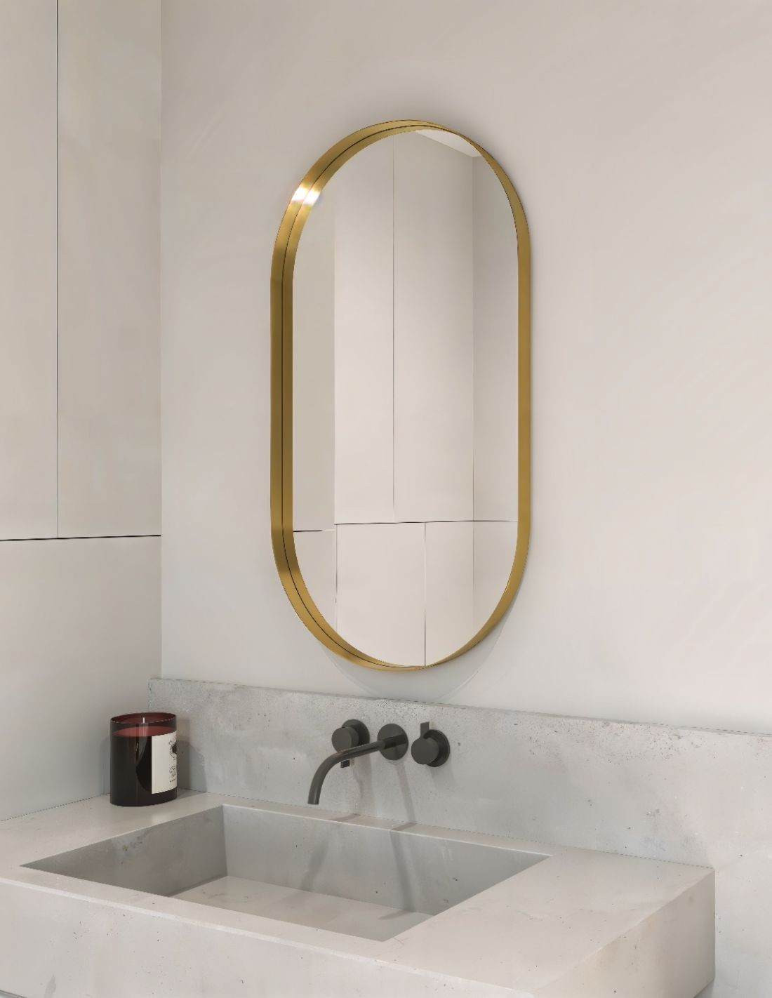 Los espejos ovalados son la elección ideal para añadir suavidad y sofisticación a cualquier baño. Su forma sin esquinas, que combina la fluidez del círculo con la verticalidad clásica, rompe con las líneas rectas tradicionales, aportando un movimiento envolvente y una sensación de mayor altura y amplitud al ambiente. Perfectos para crear un punto focal distinguido y refinado, se adaptan a estilos desde el minimalista hasta el más clásico o art déco. Son una tendencia fuerte en interiorismo de baños por su capacidad de equilibrar visualmente el espacio, especialmente sobre lavabos dobles o en baños estrechos que necesitan estilizar sus formas.