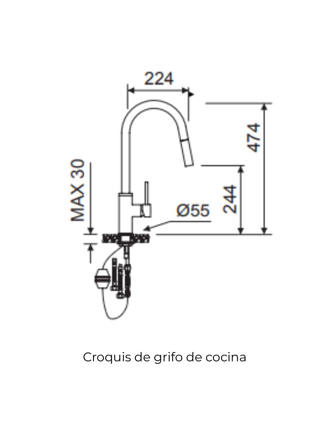 Croquis Grifo de cocina monomando extraíble - cromo BASS de Lluvibath