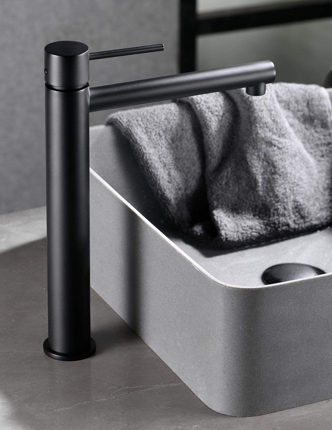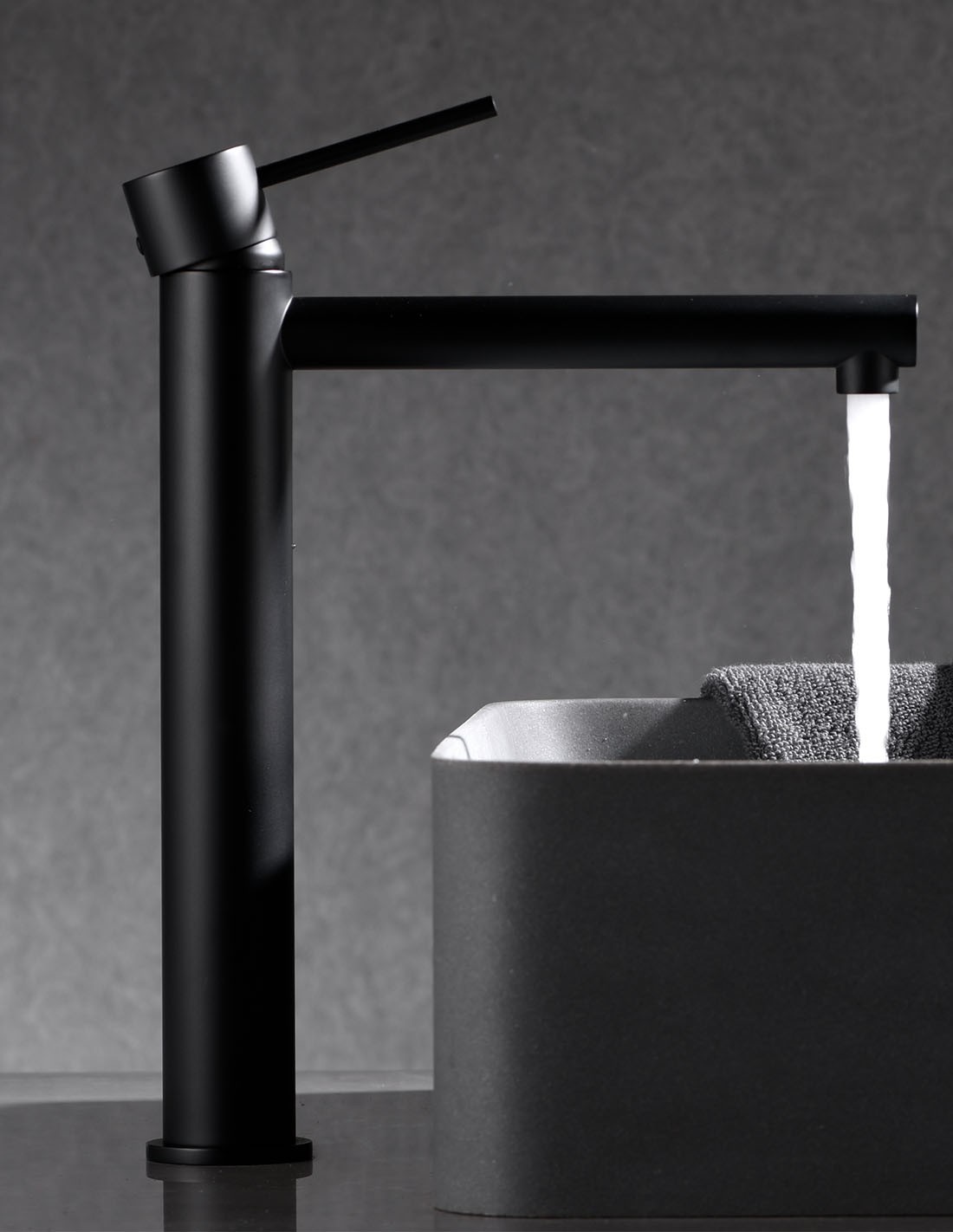 Este modelo mantiene la estética distintiva cilíndrica y delgada ("STICK") de la serie, pero con un caño más largo que se extiende sobre la pileta. Es una opción excelente para lavabos de tamaño medio a grande donde un caño estándar no sería suficiente.