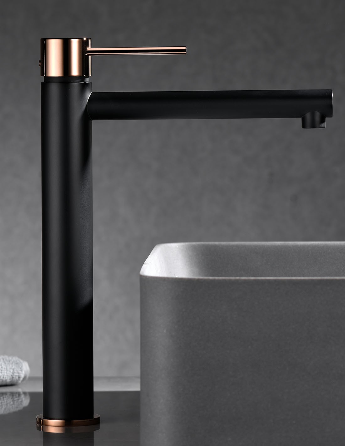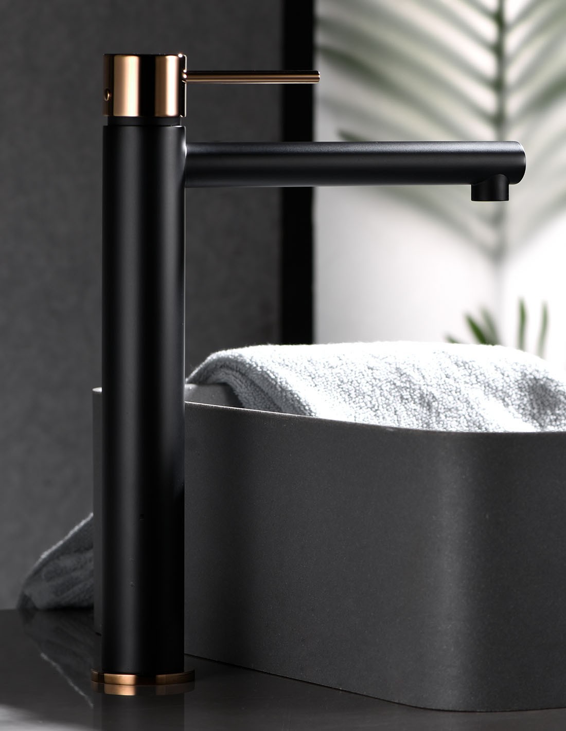 Grifo moderno lavabo largo negor oro rosa ambiente