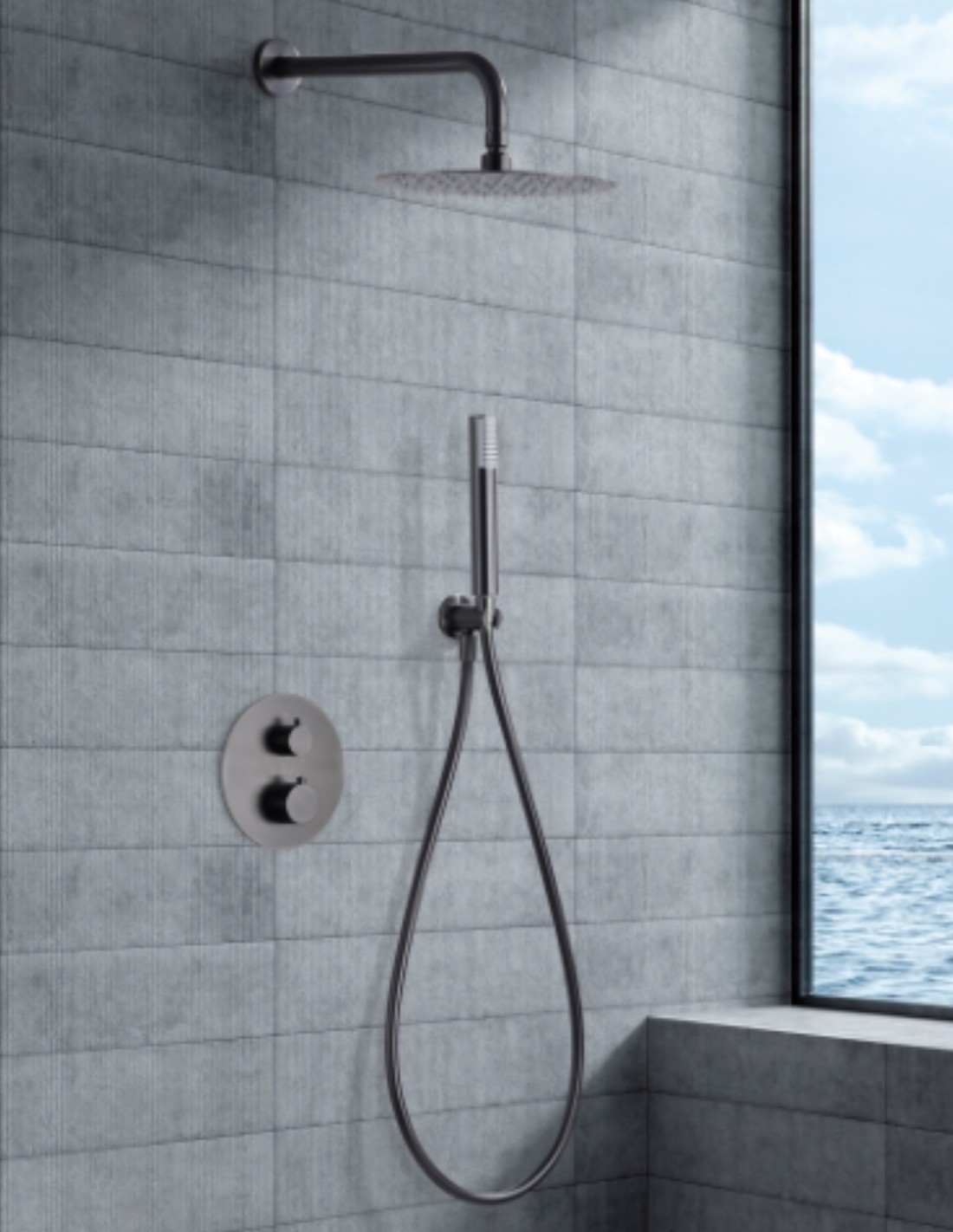 • Grifería termostática de latón negro o black gun metal de 2 vías.