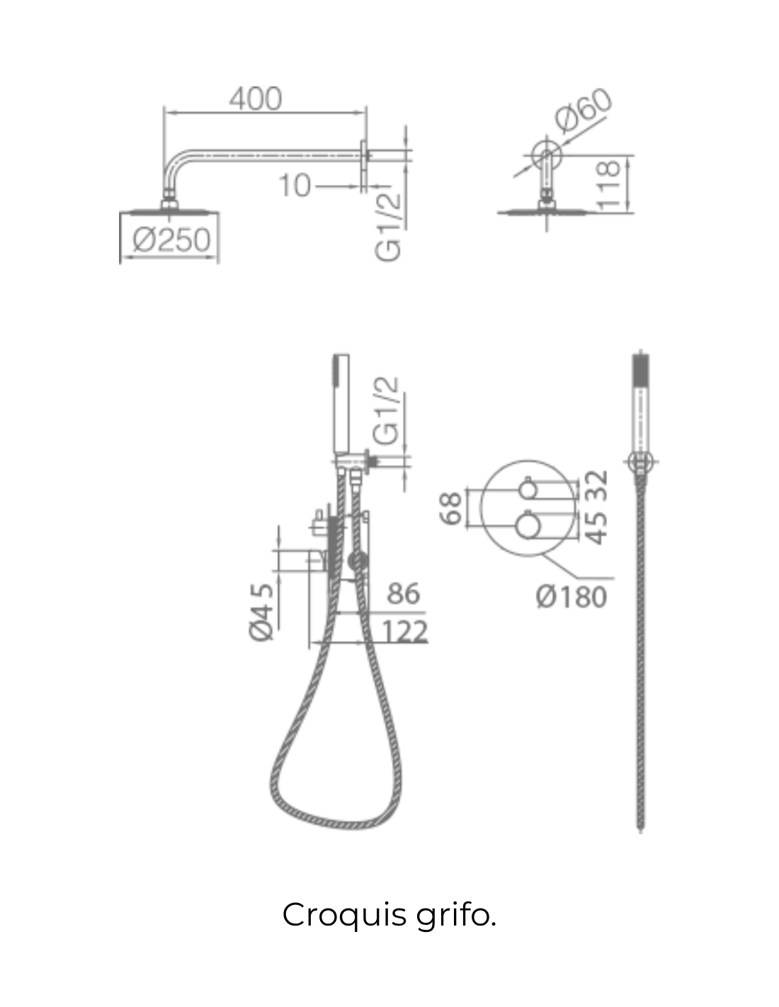Incluye: distribuidor termostático, rociador a pared, flexo y teleducha.