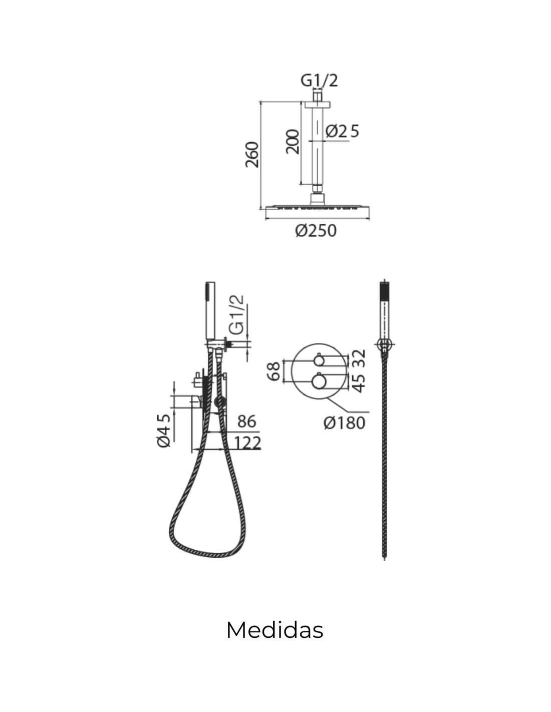 Incluye: distribuidor termostático, rociador a pared, flexo y teleducha.
