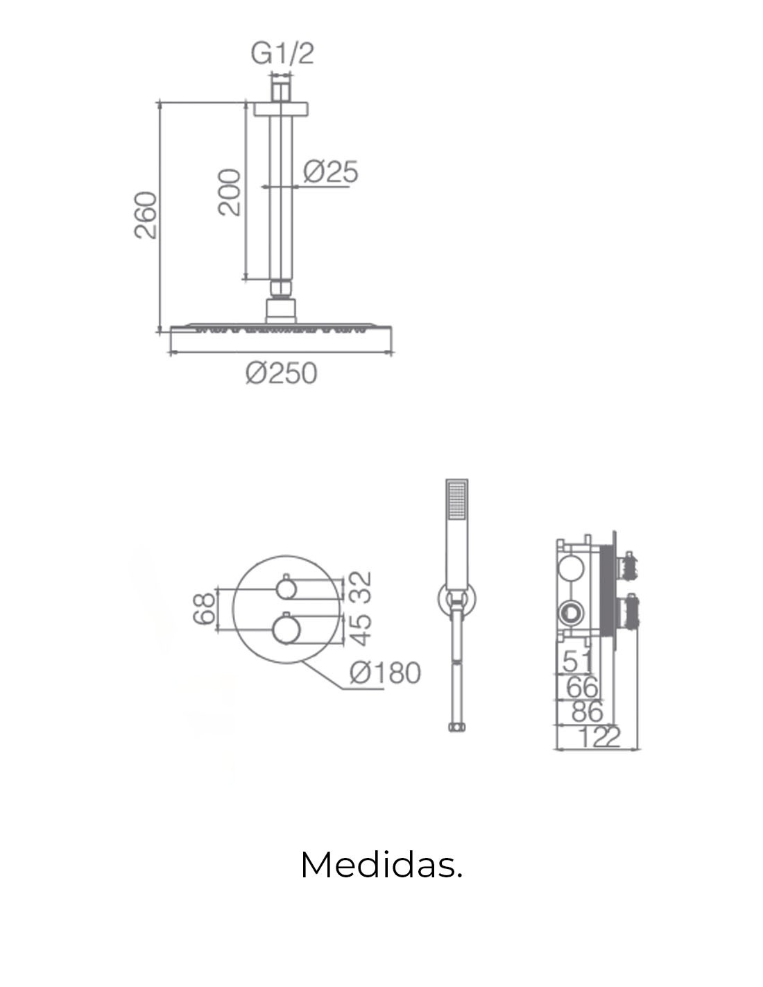 - Grifería de ducha empotrada a techo monomando.