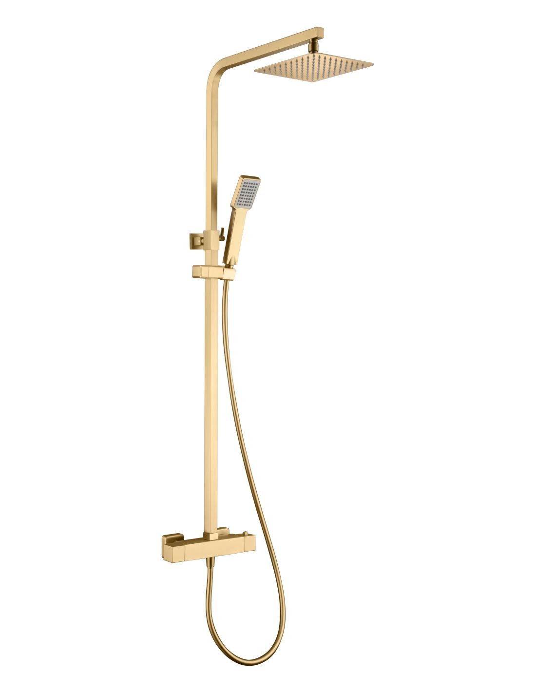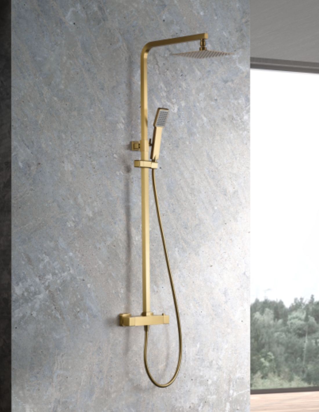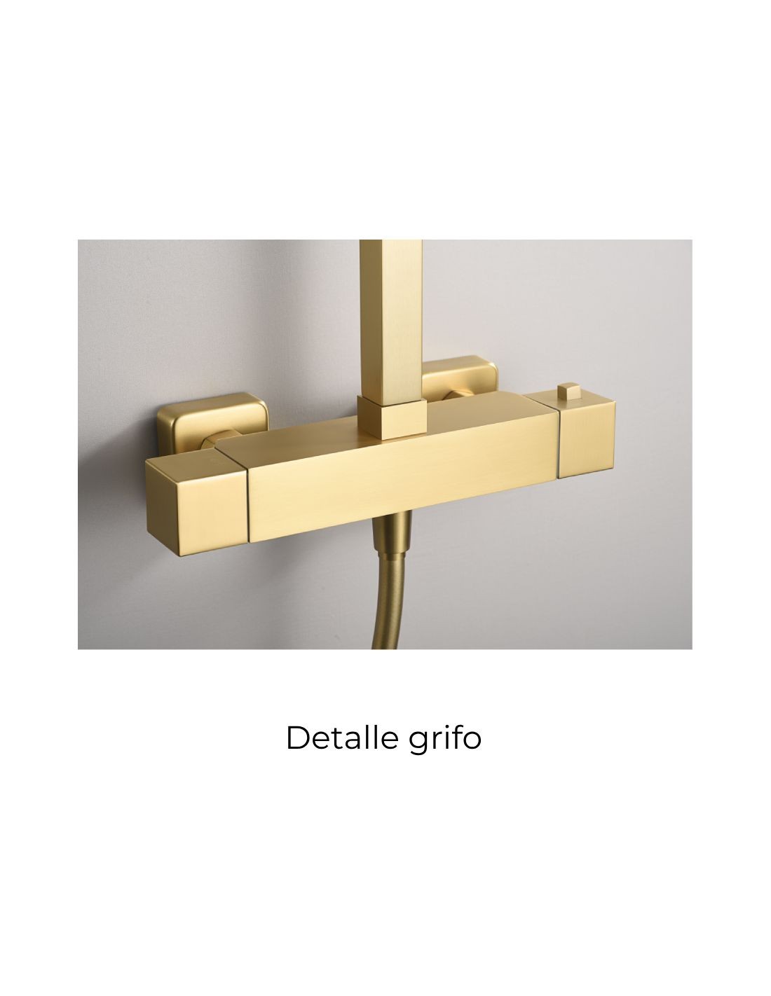 El Barra termostática ducha oro cepillado - VIGO de Ime en el exclusivo acabado Oro Cepillado (Brushed Gold) es la elección ideal para quienes buscan seguridad, precisión y una estética de lujo en la ducha. Este sistema de instalación a superficie se conecta fácilmente a las tomas de agua existentes y transforma su baño.
