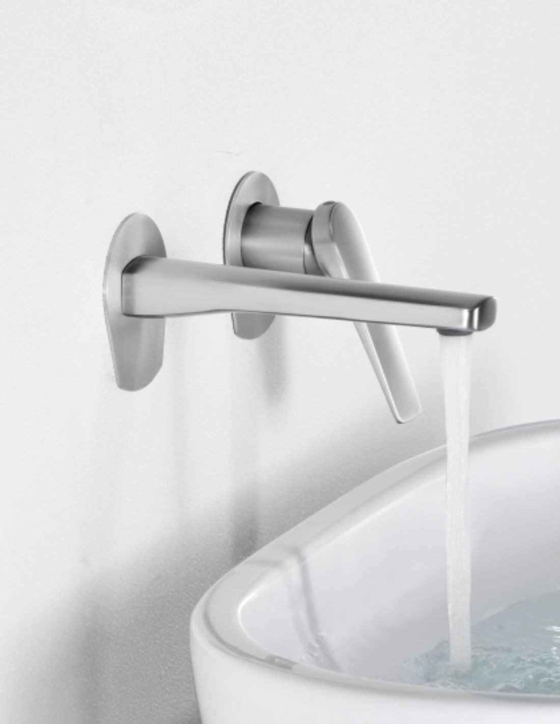 La grifería DELOS en S.316 se distingue por su diseño redondo, sobrio y funcional, que se instala directamente en la pared en dos cuerpos separados (maneta y caño), creando un efecto visual despejado y moderno sobre el lavabo.