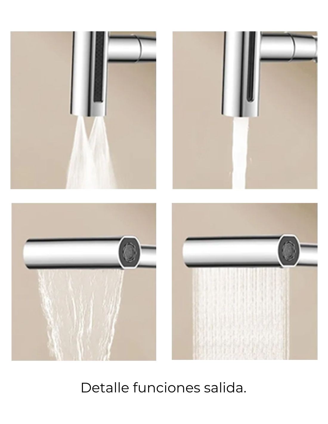 Este grifo se distingue por su diseño ergonómico y su cabezal multifunción que permite seleccionar entre cuatro salidas de agua distintas (típicamente chorro aireado, chorro spray, chorro potente y, a veces, una función de apagado/pausa o filtrado). Está fabricado en latón de alta calidad con acabados duraderos (Cromo Brillo, Negro Mate, etc.). La palanca monomando opera con un cartucho cerámico de alto rendimiento, y su caño alto garantiza total libertad de movimiento en el fregadero.