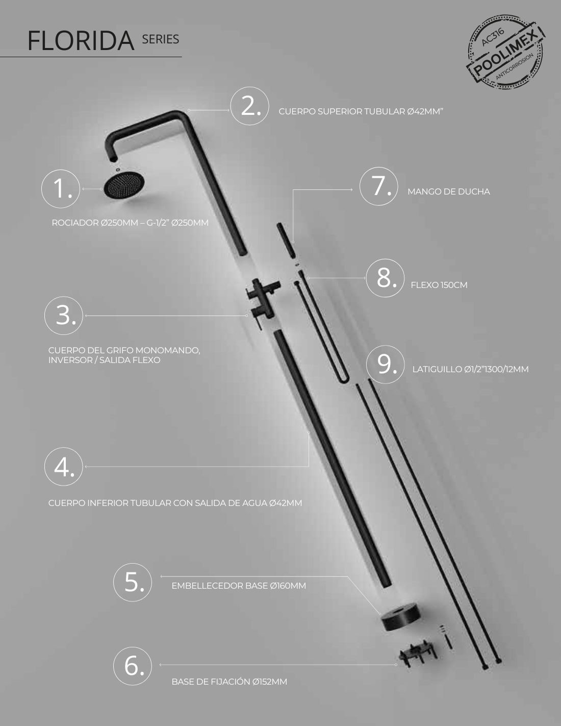 Conoce más sobre las características principales de la ducha para piscina exterior negra Florida de acero inox S316: