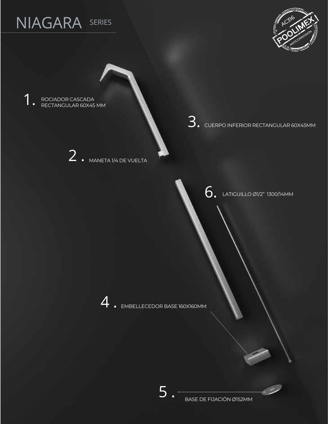 La Ducha piscina cascada - acero inoxidable S316 Niagara de Imex es una solución de lujo que combina la funcionalidad de una ducha con el atractivo visual de una cascada. Fabricada en robusto Acero Inoxidable S316, garantiza la máxima resistencia a la corrosión del cloro, la sal y el sol, ideal para exteriores. Su diseño moderno y escultural convierte la ducha NIAGARA en un elemento central de bienestar y decoración que aporta una elegancia duradera a tu zona de piscina.