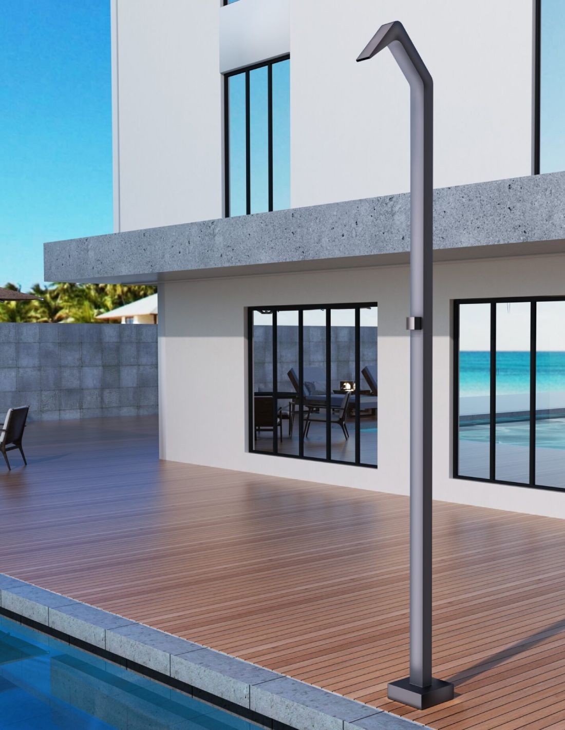 La Ducha piscina cascada negra - gris acero inox S316 modelo NIAGARA de Imex. es un elemento de diseño espectacular que transforma cualquier área de piscina o jardín en un espacio de bienestar y alto valor estético. Esta ducha no solo sirve como un refrescante elemento de jardín, sino que su efecto cascada ofrece un masaje relajante en cuello y hombros.