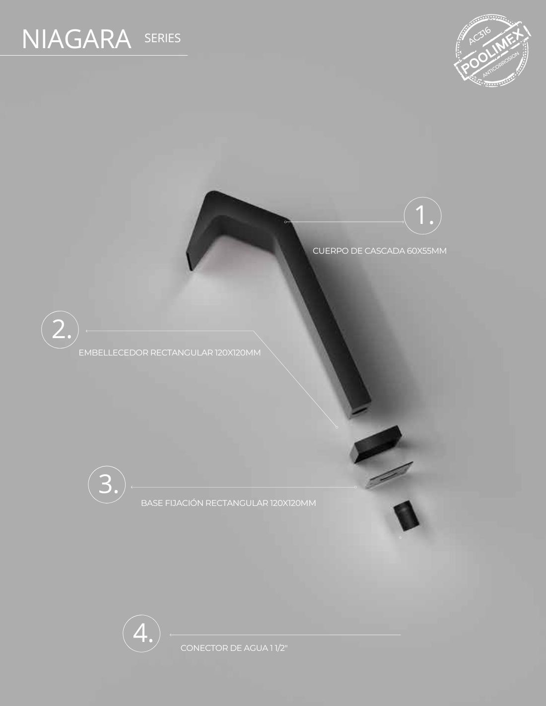 Conoce más sobre las características principales de la cascada para piscina negra - gris Niágara de acero inox S316:
