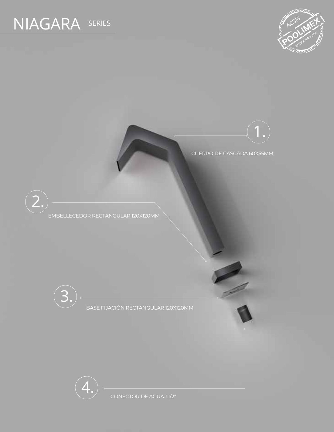 Conoce más sobre las características principales de la cascada para piscina negra - gris Niágara de acero inox S316: