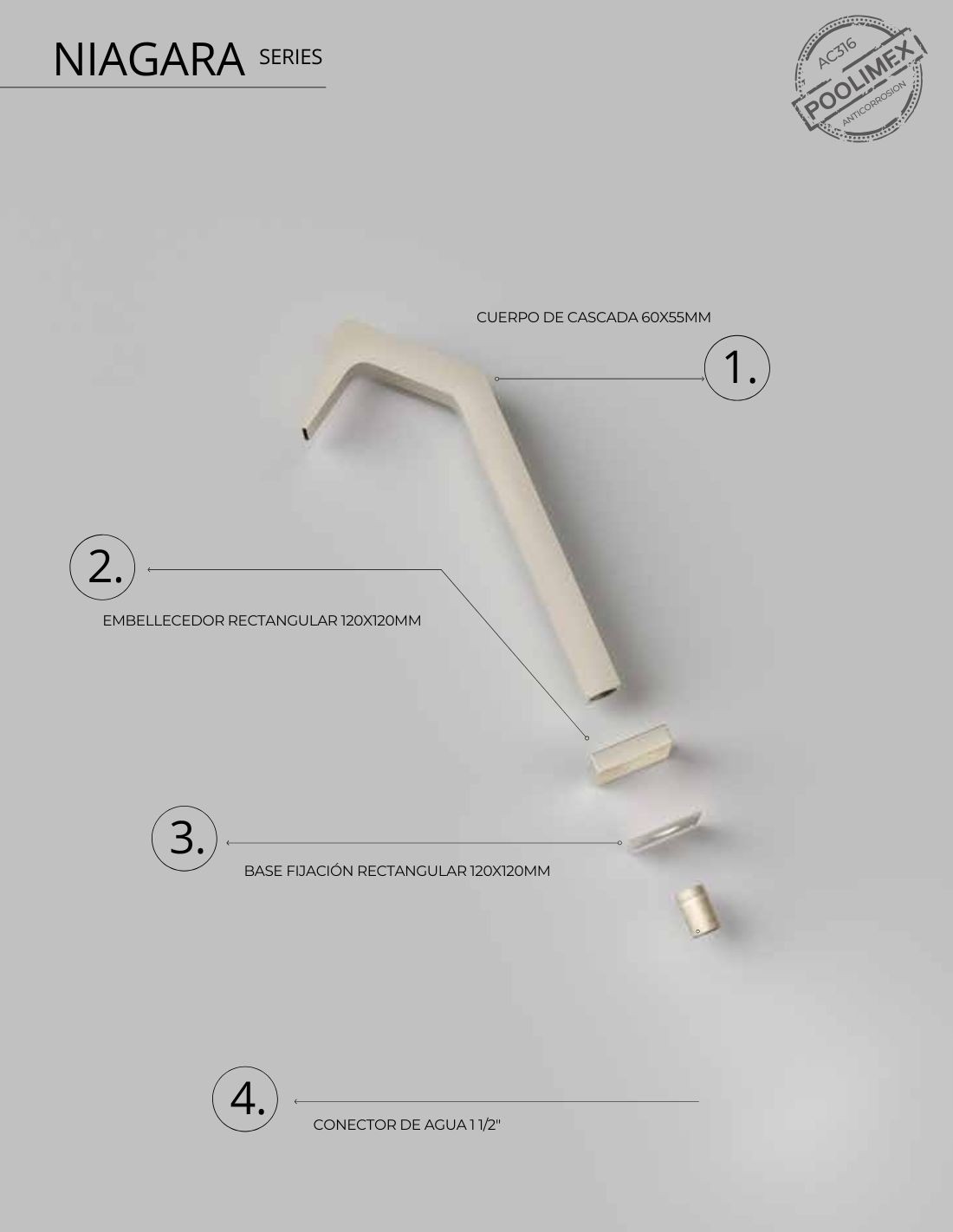 Conoce más sobre las características principales de la cascada para piscina colores Niágara de acero inox S316: