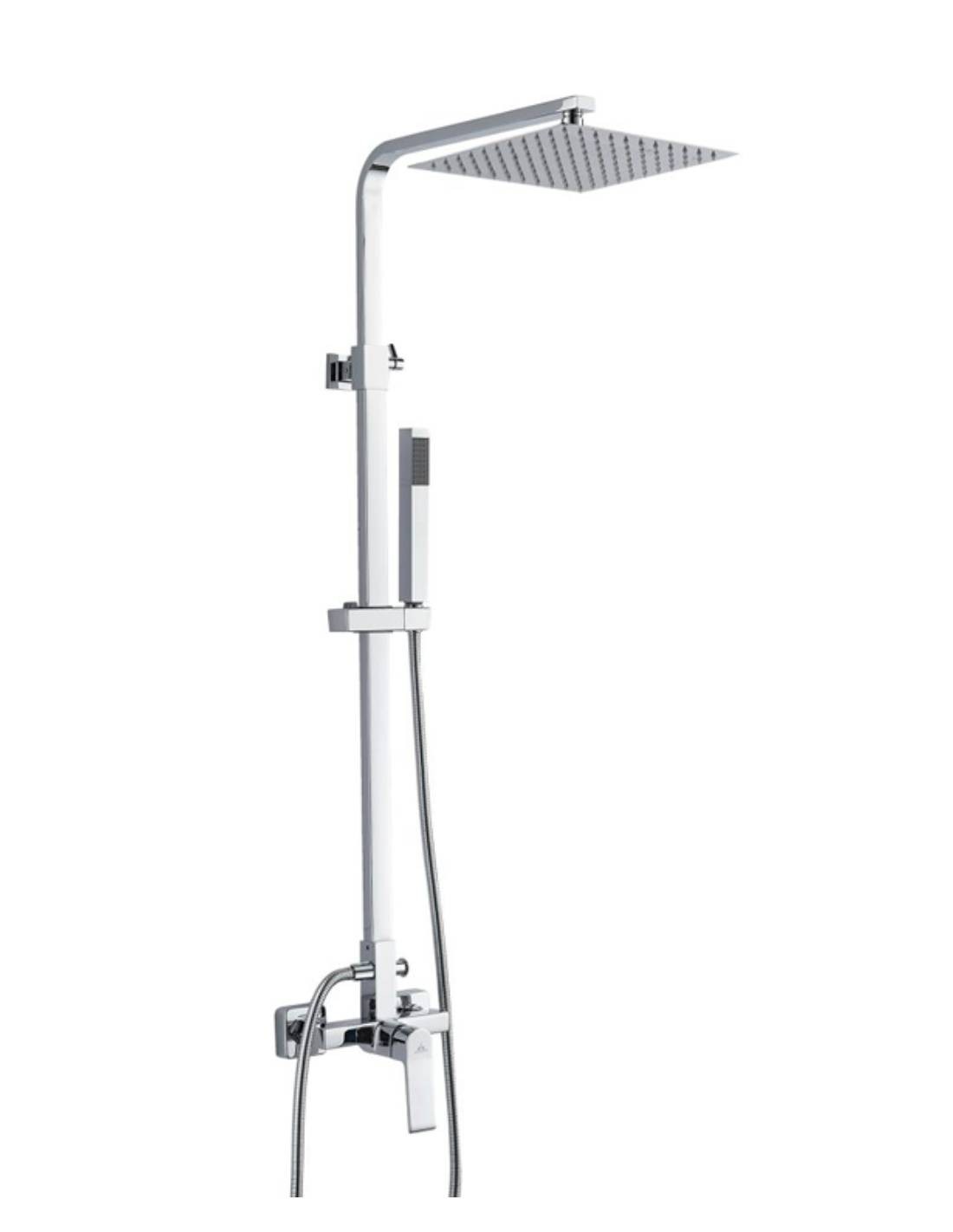 Este conjunto se distingue por su diseño estilizado y contemporáneo, característico de la serie HORUS. Está fabricado con latón y acero inoxidable (o materiales resistentes) de alta calidad. Incluye un amplio rociador superior para un efecto lluvia relajante, una ducha de mano ergonómica y un grifo monomando con cartucho cerámico de alta durabilidad que asegura un control suave y preciso de la temperatura. Su acabado en cromo brillo es atemporal y resistente a la corrosión.