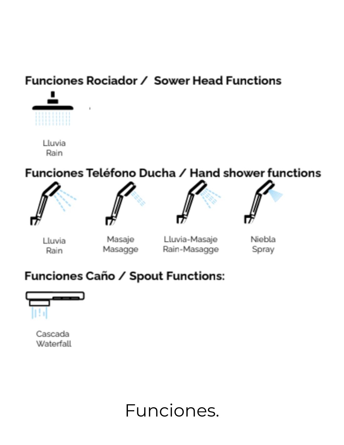 Incluye: repisa integrada, rociador superior, caño y teleducha.