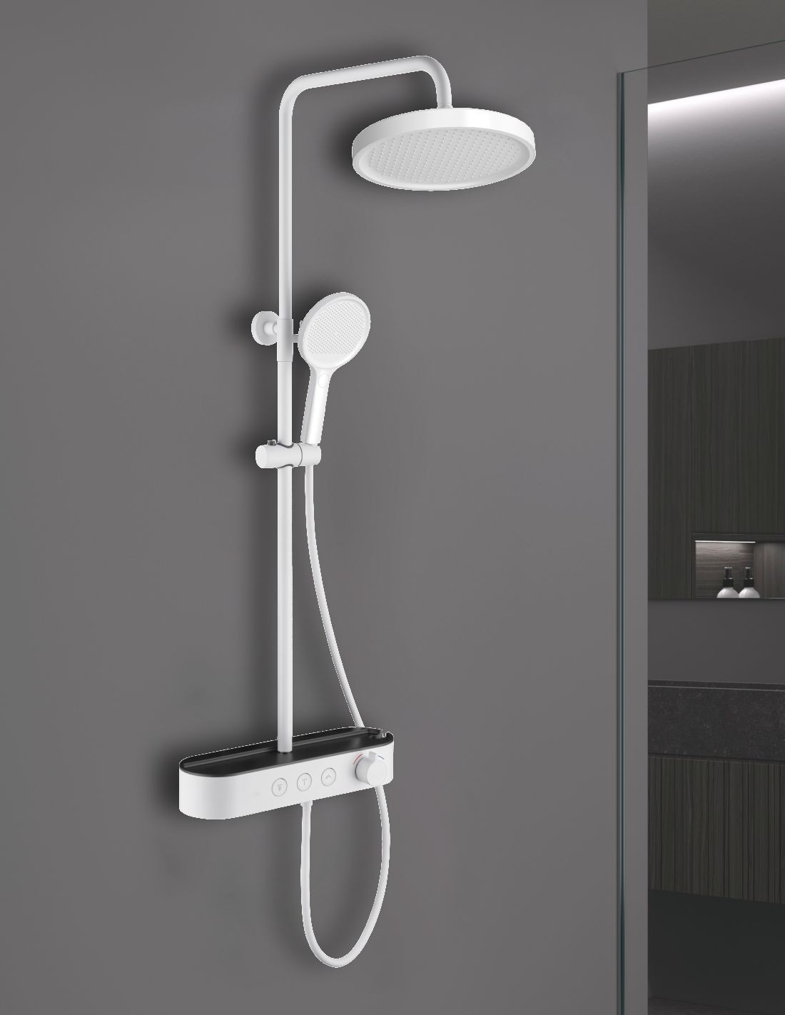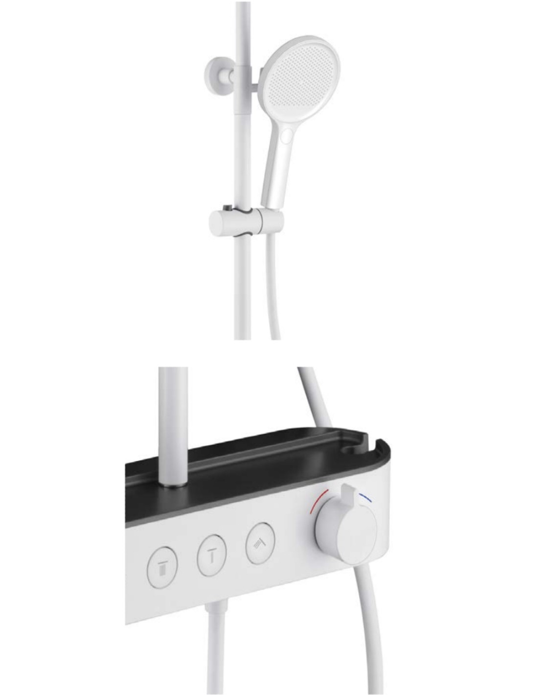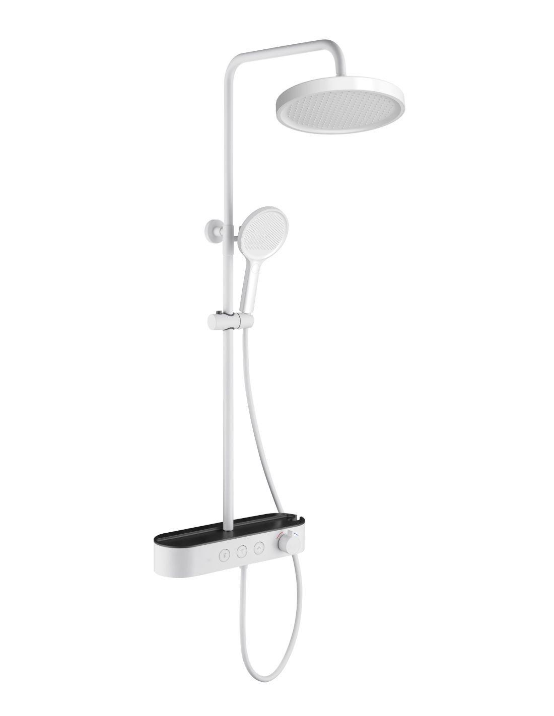 Grifería ducha con repisa modelo MIKEL blanca. También disponible en cromo y negro. Dale a tu cuarto de baño un toque moderno y sofisticado con estas columnas de ducha sin necesidad de tener que poner estantes en el baño.