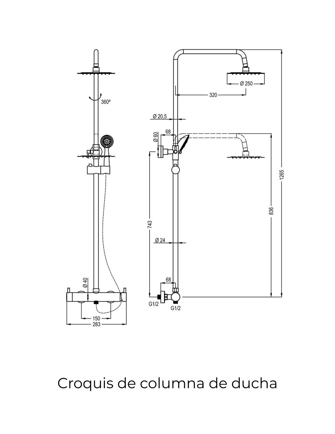 Columna de ducha monomando termostática con tubo extensible de 100 a 150 cm rociador y tele ducha.