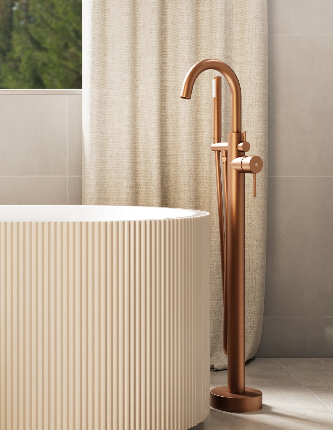 Eleva tu cuarto de baño a la categoría de spa de lujo con la grifería bañera exenta cobre Round de GME. Esta pieza es mucho más que un grifo; es un elemento arquitectónico diseñado para acompañar a las bañeras de diseño independiente (bañeras exentas), aportando una presencia majestuosa y una funcionalidad superior. Su diseño basado en la pureza de las líneas cilíndricas crea una estética fluida y minimalista que encaja a la perfección en baños modernos y diáfanos.