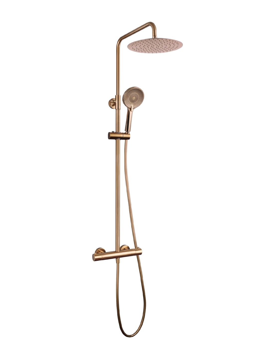 Actualiza tu cuarto de baño con la sofisticación del acabado tendencia: la Ducha telescópica termostática cobre - Round élite de GME. Este sistema es la elección perfecta para quienes buscan una alternativa al cromo tradicional, ofreciendo un tono metálico más cálido, suave y contemporáneo. Su estética de inspiración industrial refinada combina magistralmente con texturas como la madera, el cemento o la piedra, aportando un aire de exclusividad y serenidad a tu zona de aguas.