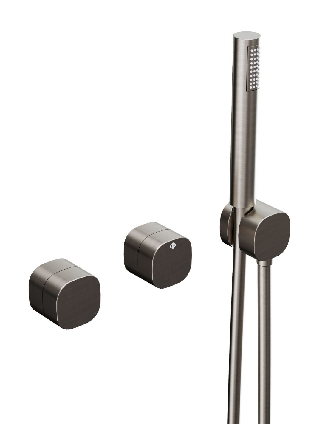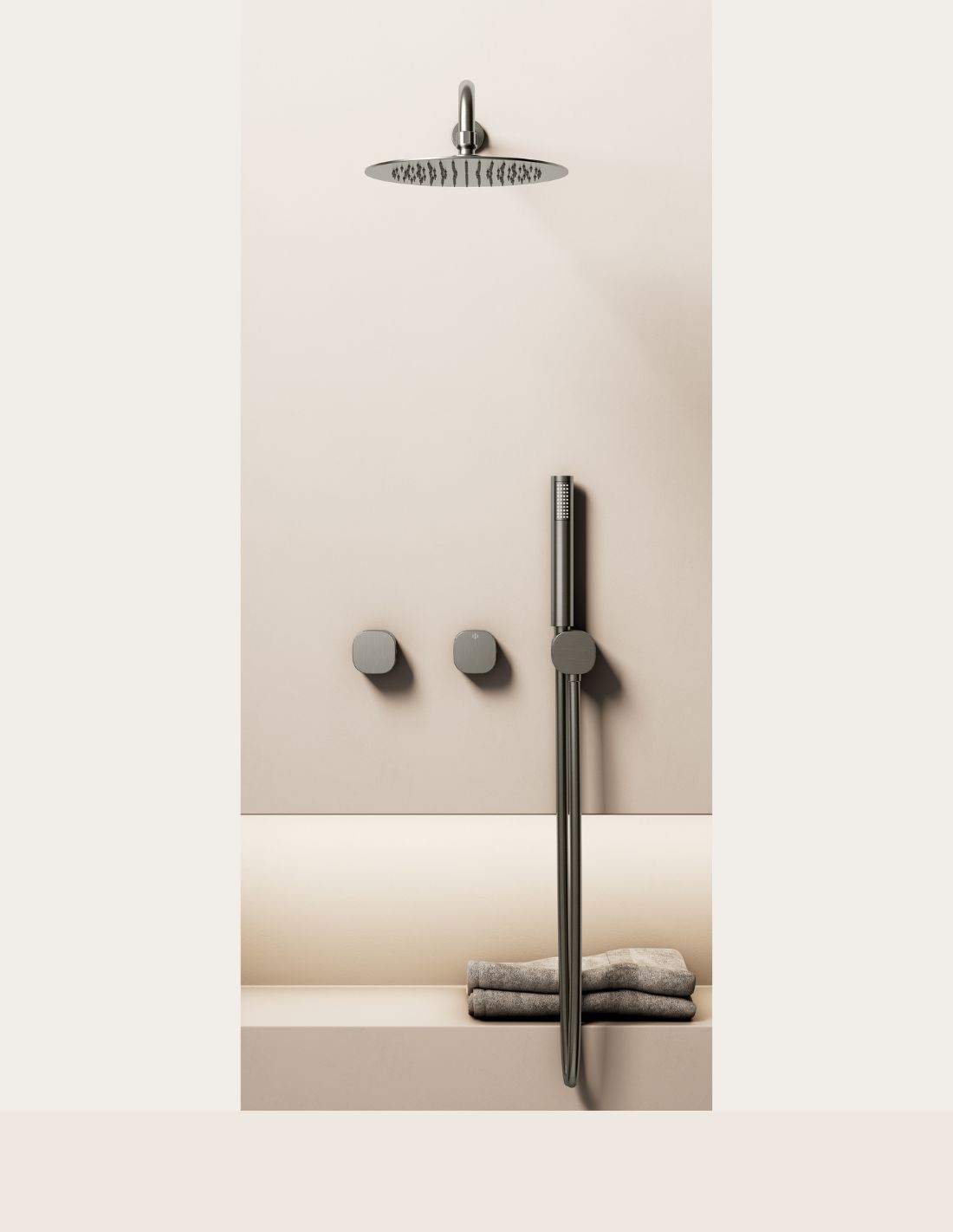 Lleva el confort y la elegancia a tu zona de baño con el Conjunto empotrable titanio - Versátil de GME, una propuesta de GME diseñada para combinar tecnología de vanguardia con una estética impecable. Este sistema destaca por su capacidad de adaptación a cualquier proyecto, ofreciendo una instalación limpia que libera espacio visual y físico en tu ducha.