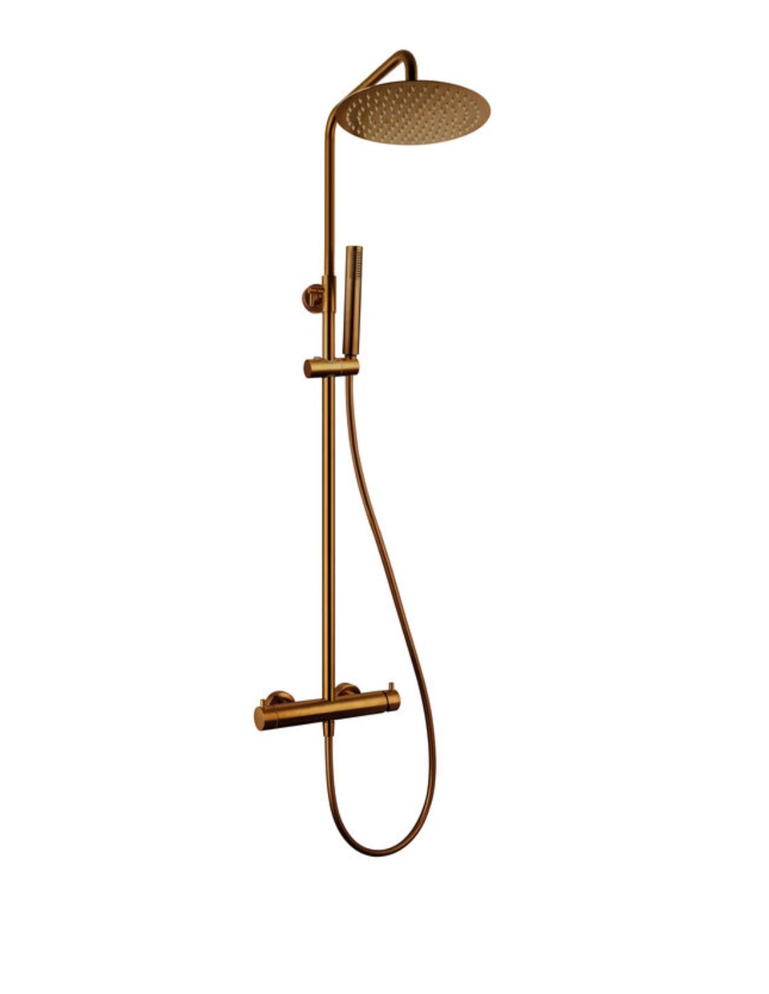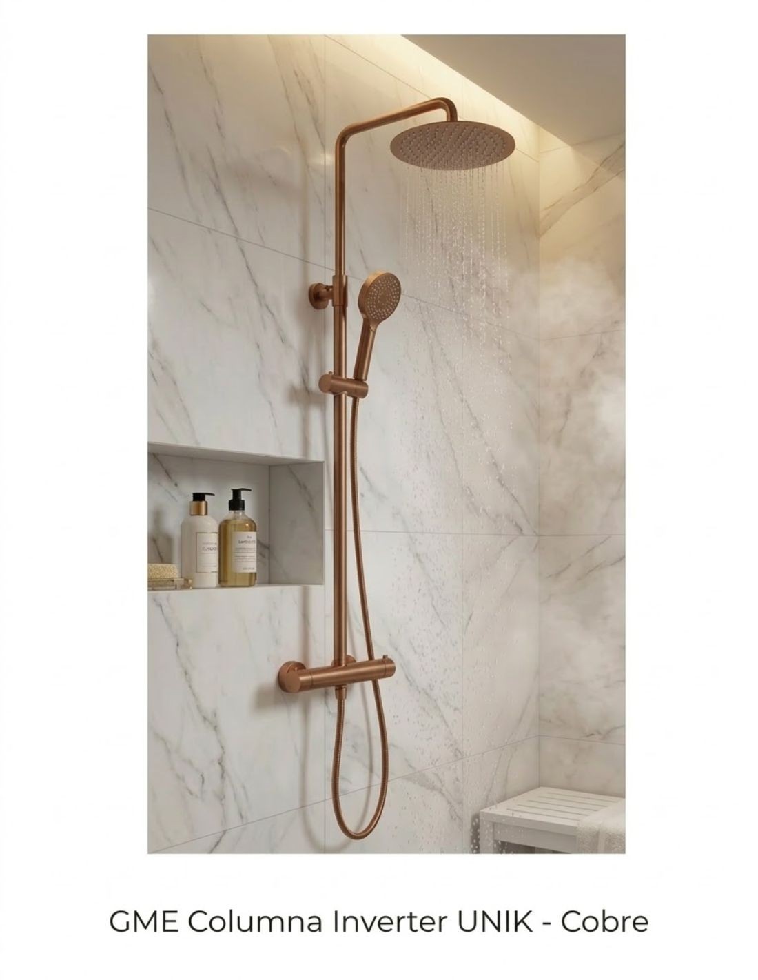 La Columna monomando cobre - Inverter UNIK de GME representa la vanguardia en sistemas de ducha monomando. Su diseño se caracteriza por un cuerpo de grifería cilíndrico donde el desviador de caudal está integrado directamente en el mando, eliminando pomos externos y logrando una estética ultra limpia y arquitectónica. Gracias a su tecnología 'Cold-Start', la columna promueve el ahorro energético al evitar el encendido accidental de la caldera en la posición central del mando.