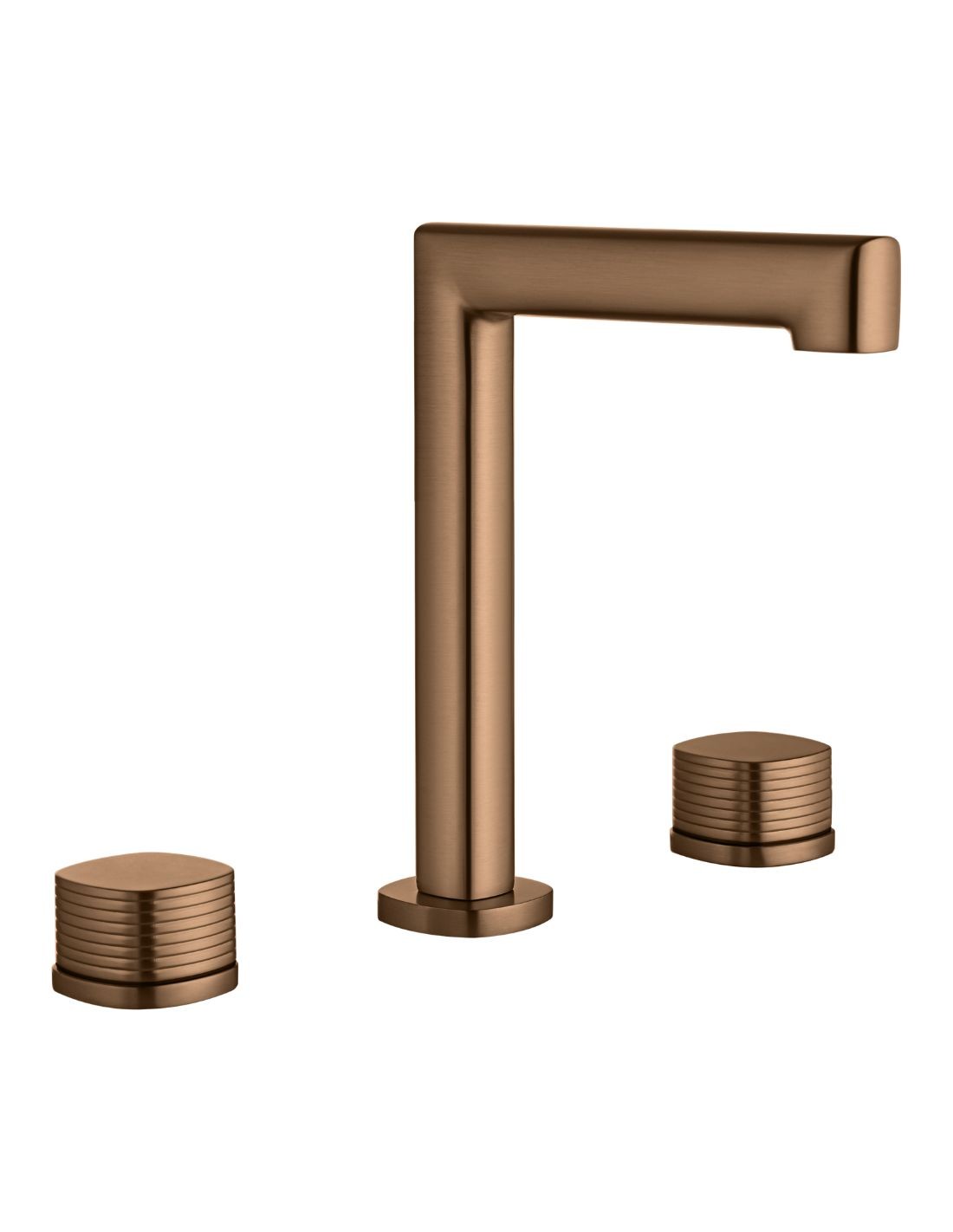 El acabado oro rosa cepillado no solo resalta sus formas, sino que actúa como un espejo que aporta luminosidad y una sensación de limpieza impecable a la zona de aseo