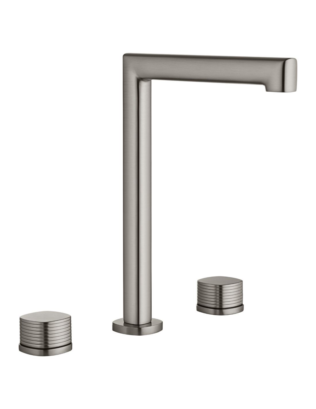 Su acabado en níquel cepillado resalta las líneas curvas del caño, aportando una luminosidad extra y una sensación de higiene y sofisticación que perdura en el tiempo.