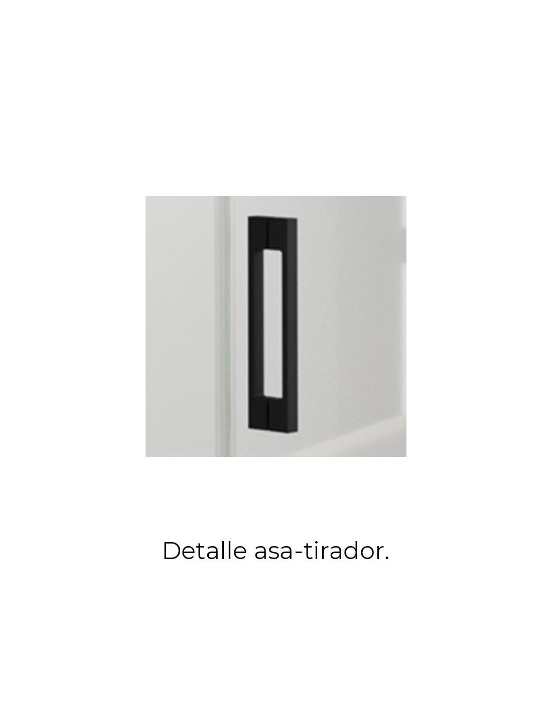 Esta mampara dispone de perfilería de aluminio con acabado lacado negro mate y está compuesta por vidrio templado de 6 mm de espesor, que puede ser transparente o decorado por impresión digital.