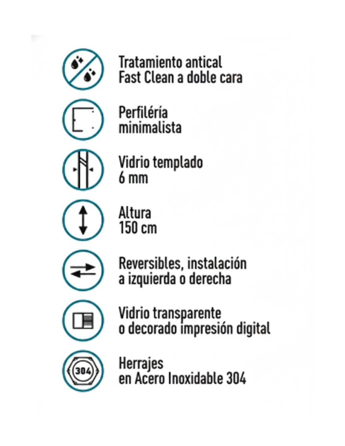 Esta mampara dispone de perfilería de aluminio con acabado lacado cromo y está compuesta por vidrio templado de 6 mm de espesor en transparente.
