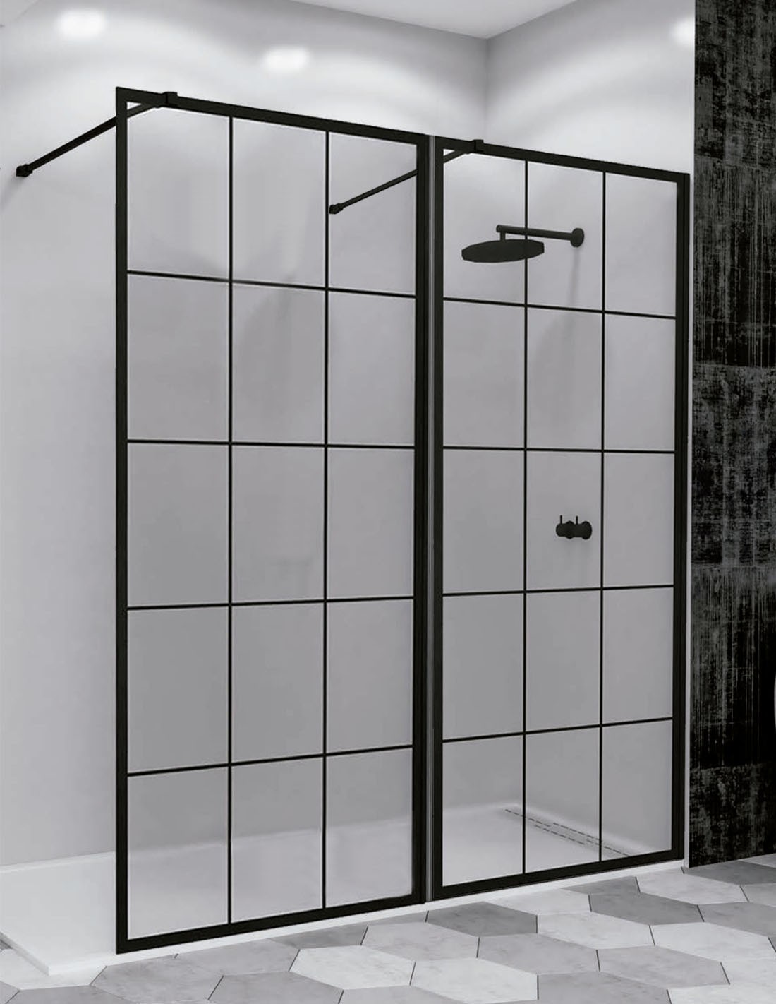 Disponible en Vidrio de 6 mm: Transparente / Decorada: cuadros black line.
