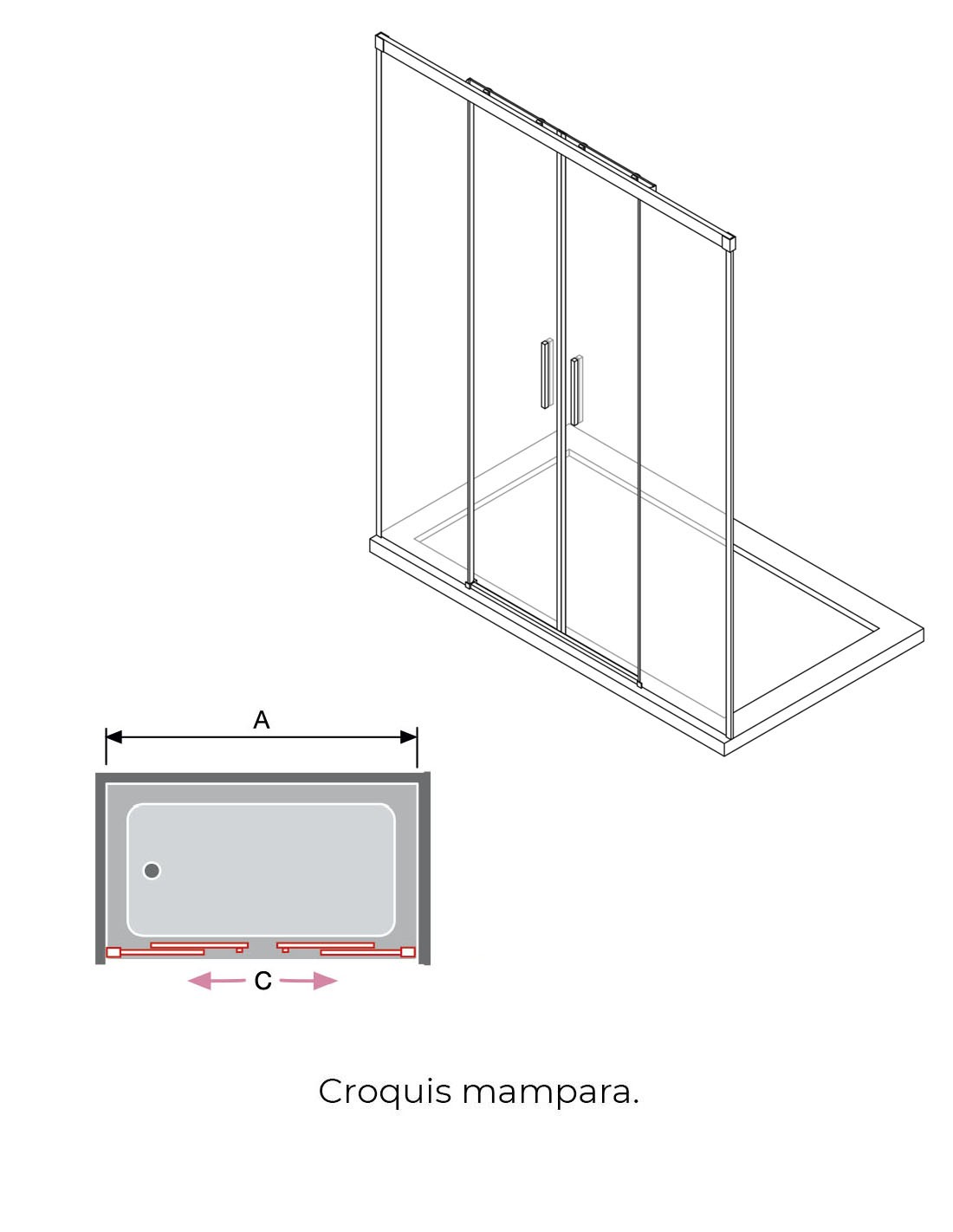 Características generales de la mampara de ducha frontal dos fijos y dos correderas: