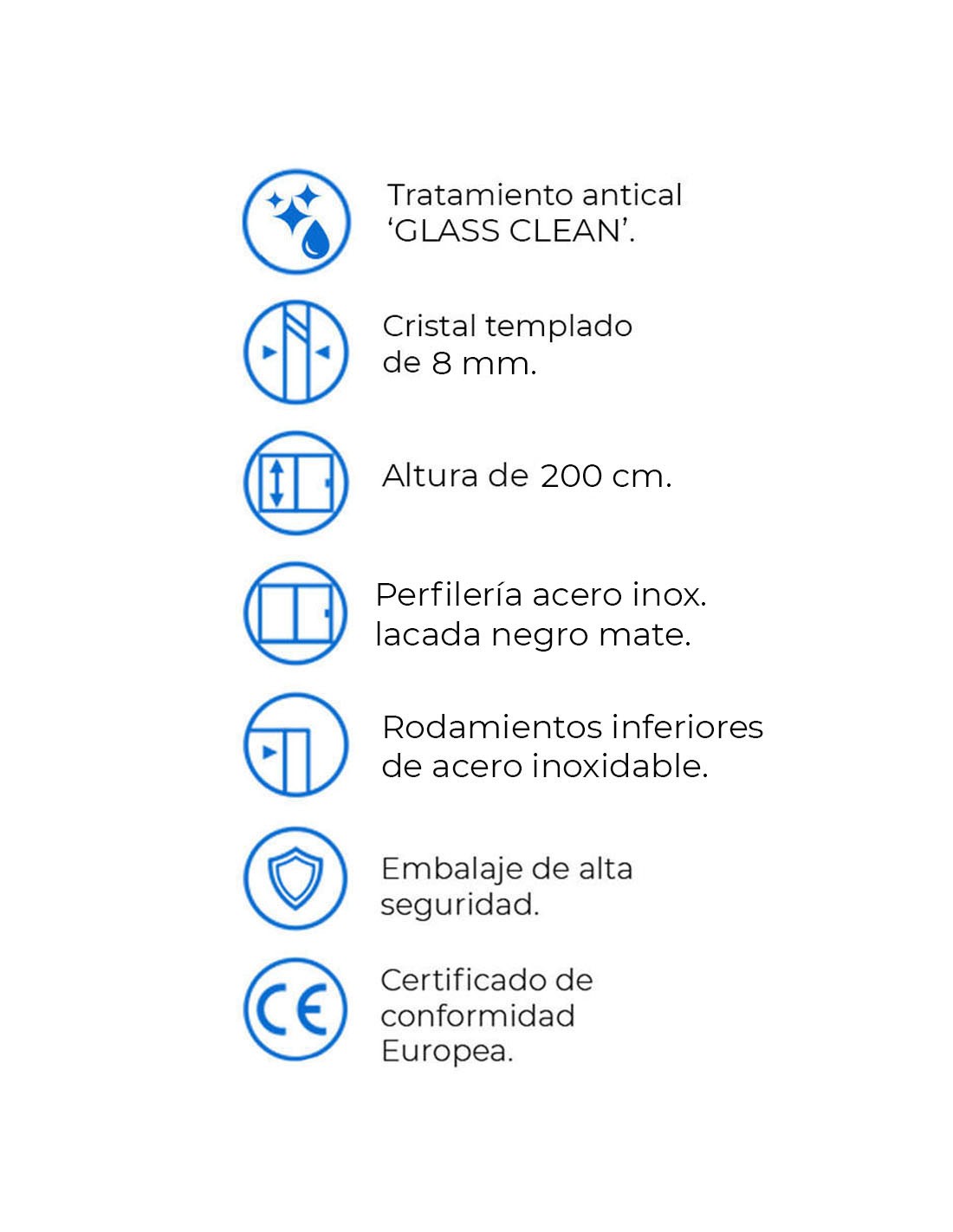 - Limpieza: Se recomienda para un eficaz mantenimiento de la mampara, limpieza del vidrio con agua limpia y secar con un paño suave (importante secar el vidrio).
