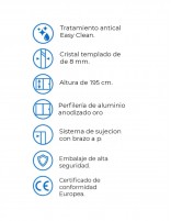 Vidrio templado de seguridad de 8 mm de espesor. En caso de rotura se parte trozos pequeños que no se desprenden de la estructura de la mampara.