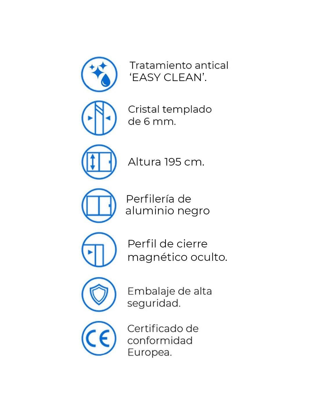 Esta mampara dispone de perfilería de aluminio con acabado negro y está compuesta por vidrio templado de 6 mm de espesor transparente.