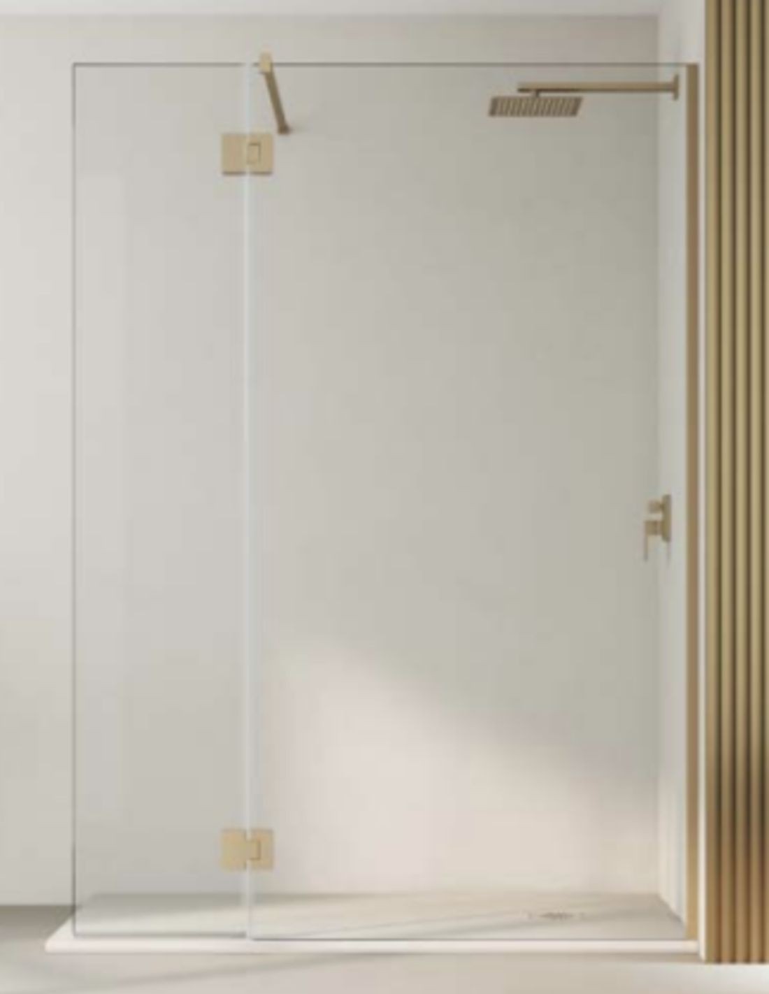 ¿Buscas una mampara que evite las salpicaduras de agua pero no te ocupe toda la ducha? Te recomendamos la mampara dorada fija y abatible modelo IN OUT MUXIA con hoja fija y puerta abatible.