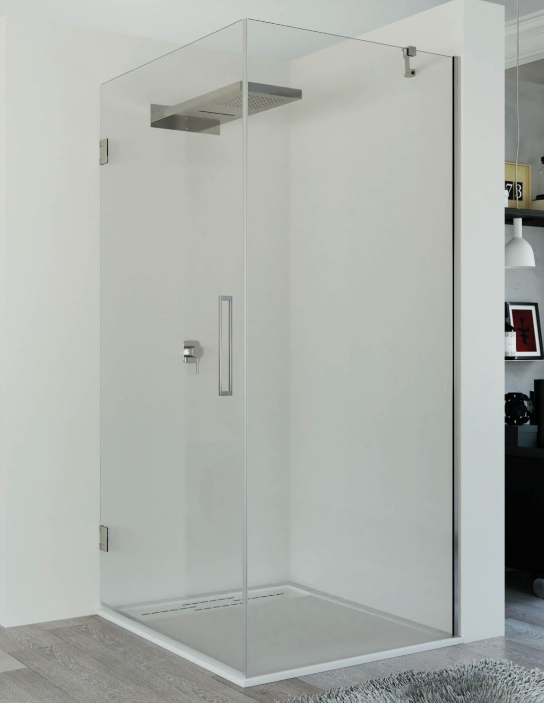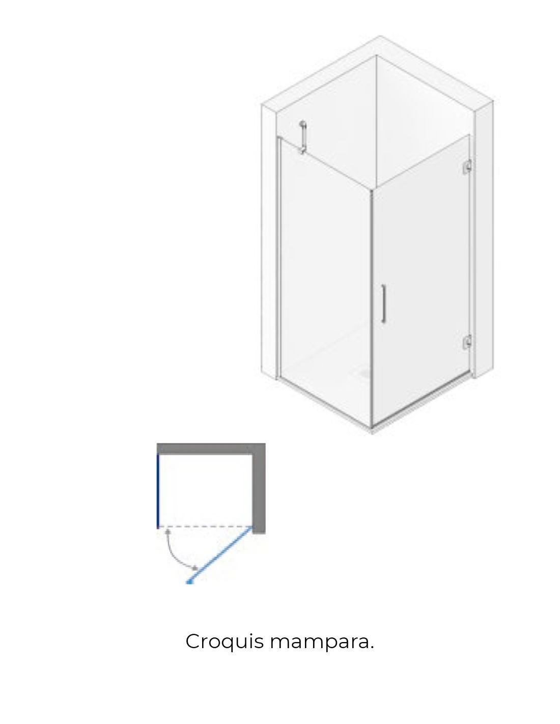 - Tipo de Vidrio de la Mampara abatible angular: Vidrio templado de seguridad de 6 mm de espesor Transparente o Decorado Banda Central Mate o Decorado Líneas.
