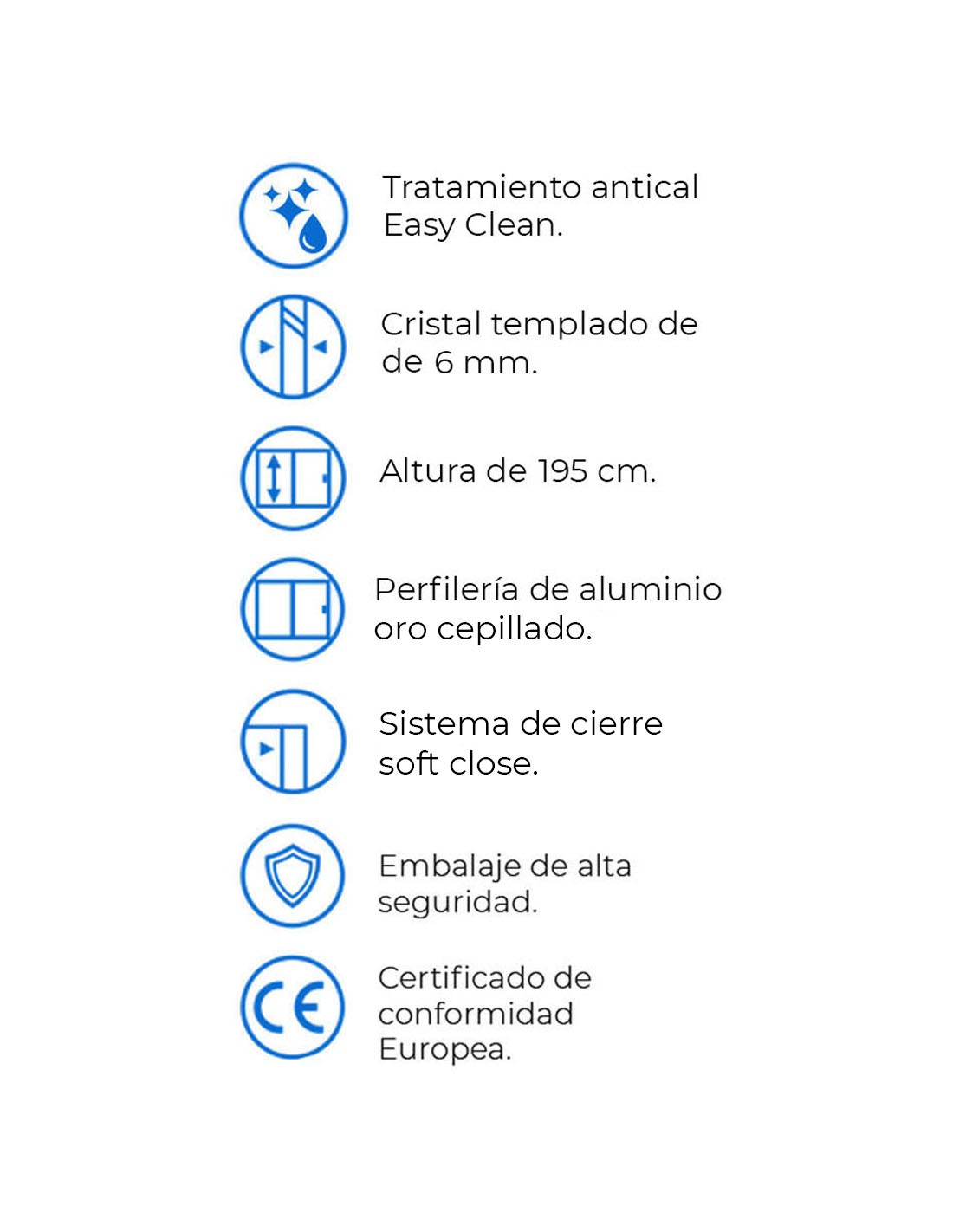 Vidrio templado de seguridad de 6 mm de espesor. En caso de rotura se parte trozos pequeños que no se desprenden de la estructura de la mampara.